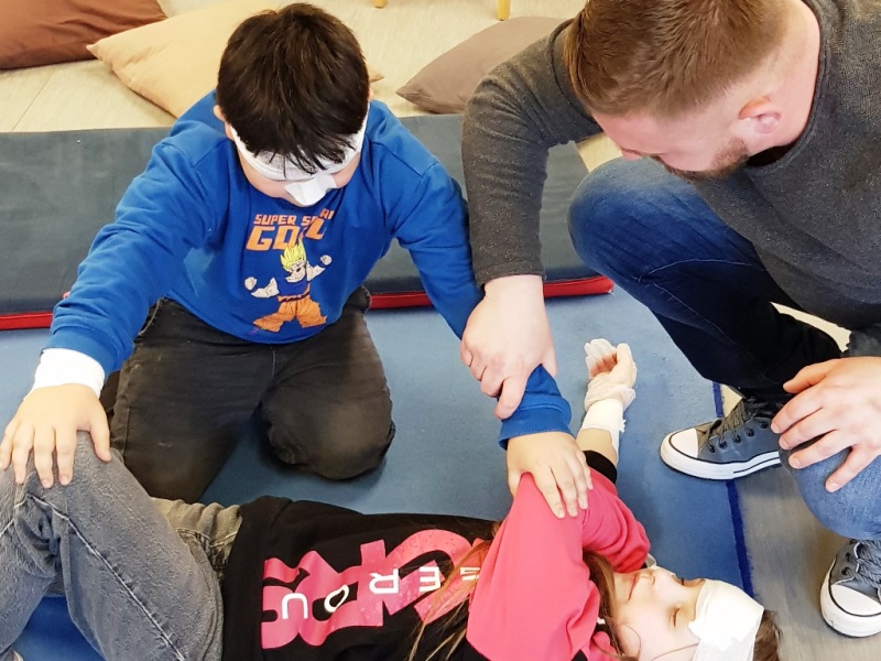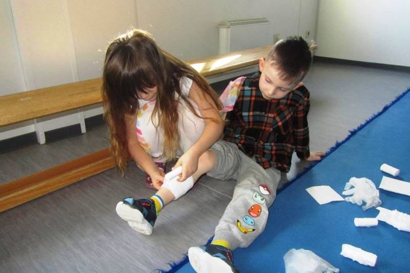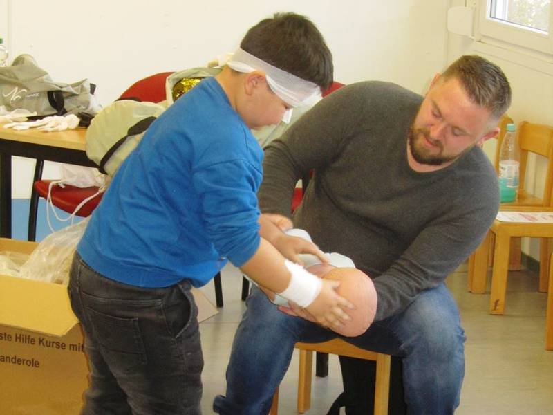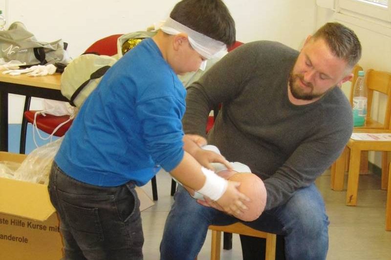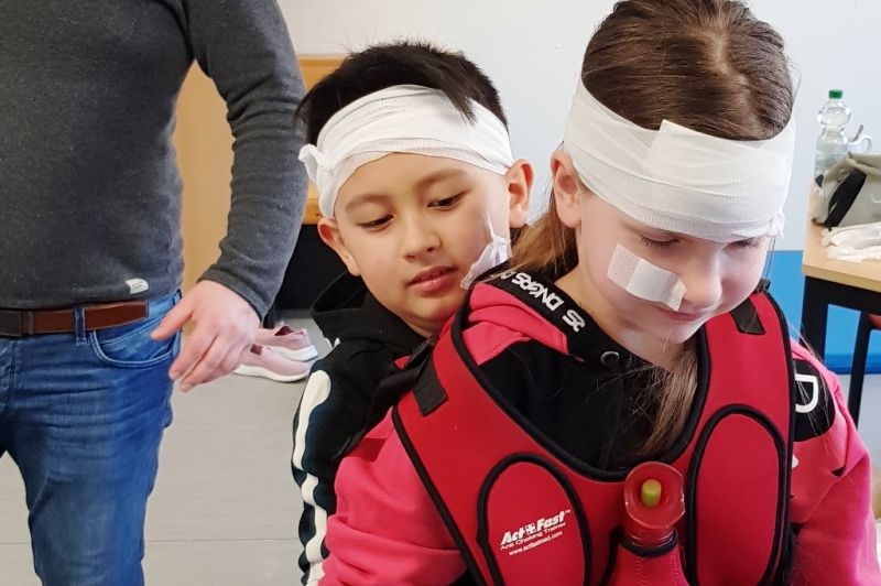 Die wichtige Telefonnummer 112 für den Rettungswagen kannten viele der Kinder schon. Sie haben unterschiedliche Verletzungen behandelt. Begeistert haben sich die Teilnehmer*innen gegenseitig verbunden. Sie haben gelernt, dass jemand, der ohnmächtig ist, ersticken kann, wenn die Zunge die Atemwege verschließt und geübt, ein Kind in die stabile Seitenlage zu bringen. Auch zwei Möglichkeiten konnten die jungen Sanitäter*innen ausprobieren um einem Kind zu helfen, dass sich an einem Bonbon verschluckt hat. Ganz spannend wurde es, als sie die Puppe Erwin „operiert“ haben und dabei die verschiedenen Organe und deren Aufgaben kennengelernt haben.
