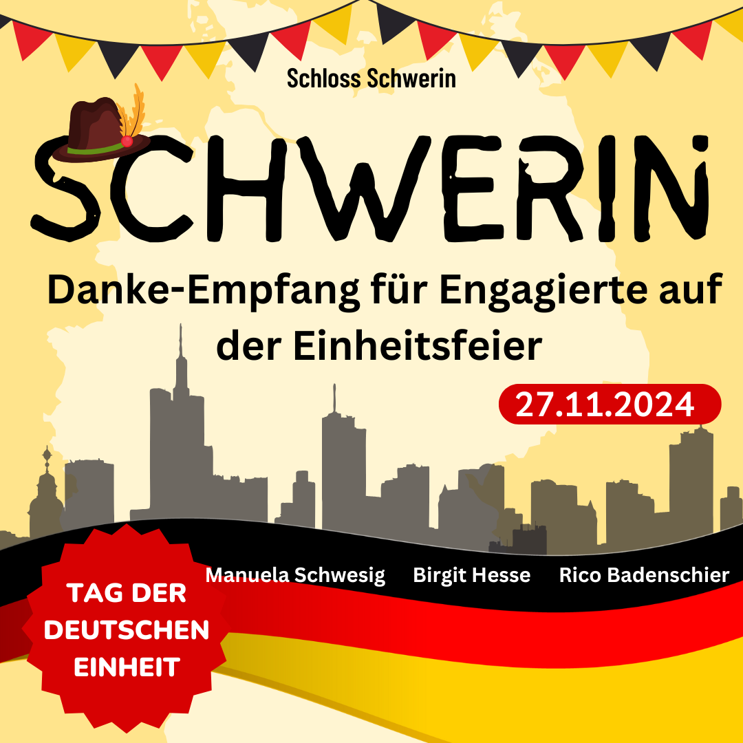 Die Ministerpräsidentin von Mecklenburg-Vorpommern, Manuela Schwesig, hat am Mittwochabend zu einem Danke Empfang in den Schweriner Schlosshof eingeladen. Anlass der Veranstaltung war, den zahlreichen engagierten Menschen zu danken, die zum Gelingen des Bürgerfests beigetragen haben.