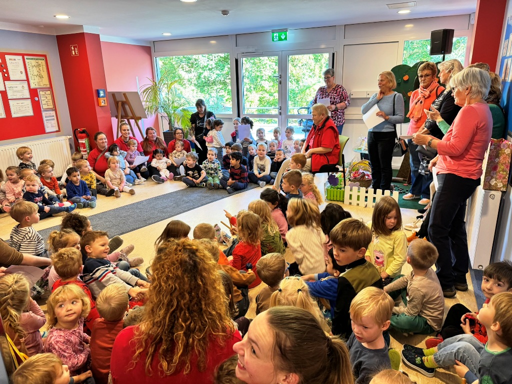 Ende September haben wir unsere Kolleginnen Gabi nach unglaublichen 51 Jahren in der AWO Kita Regenbogen verabschiedet – gemeinsam mit allen Kindern, Kolleg:innen, Küchenkräften, Hausmeistern und sogar einigen ehemaligen Mitarbeitenden. Im selben Jahr, als Nina Hagen sang: „Du hast den Farbfilm vergessen…“, begann Gabi ihre Reise bei uns. Zum Glück hat sie den Farbfilm nie vergessen – im Gegenteil: Sie hat über fünf Jahrzehnte lang Farbe, Freude und ganz viel Herz in unseren Kita-Alltag gebracht.