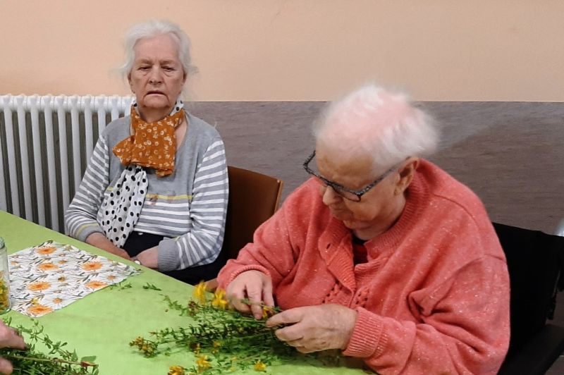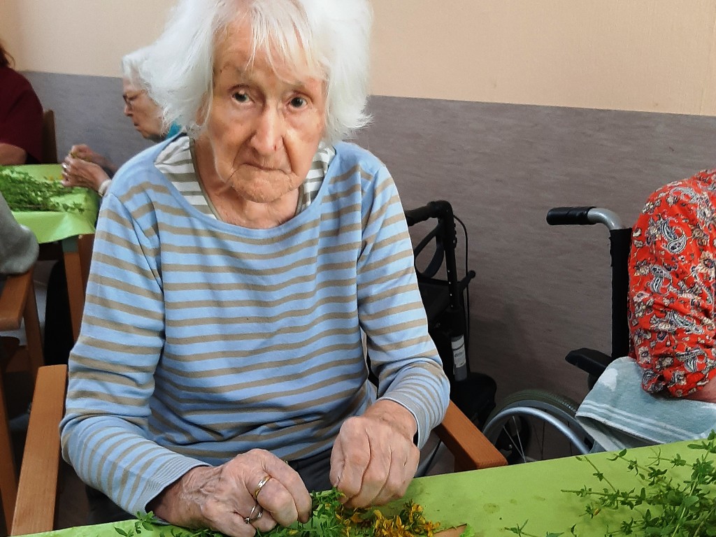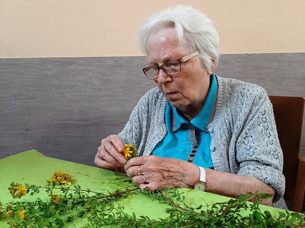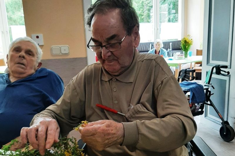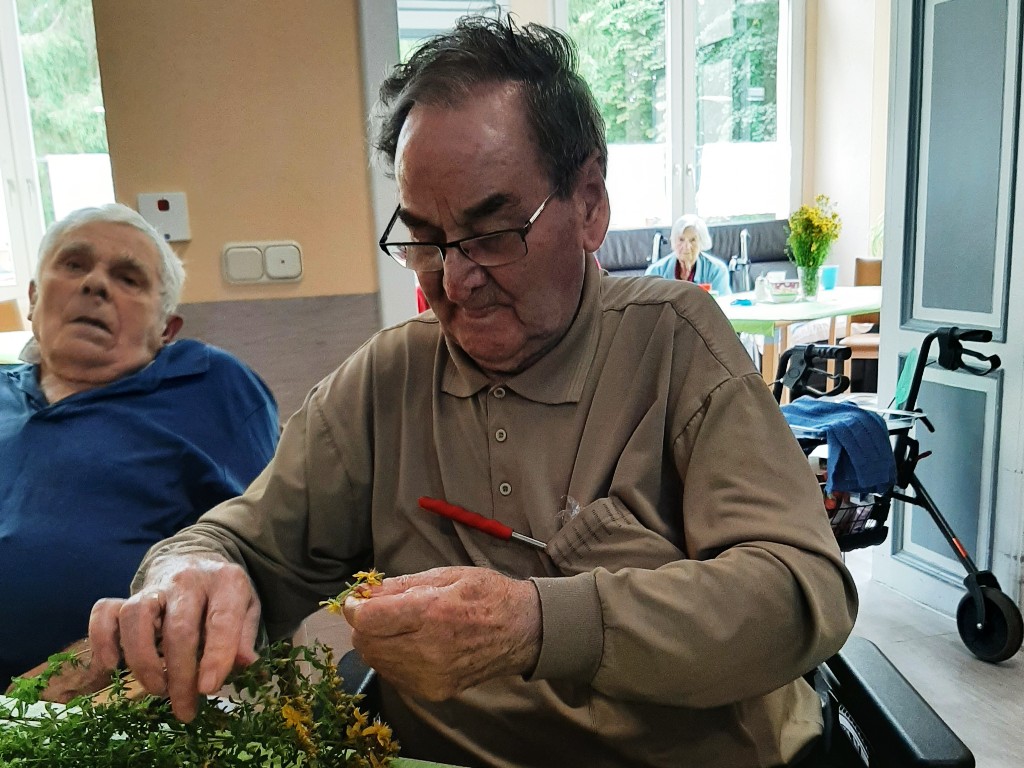 Am 24. Juni feierten wir gemeinsam mit unseren Bewohnern das erste Johannisfest. Es war spannend zu beobachten, was unsere Bewohner für Vorstellungen zu diesem Fest hatten und viele dachten es gehe "nur"um ein kirchliches Fest. Die Verbindung zu Ernte, Garten oder Mittsommer war kaum jemanden bewusst. So fand ein interessanter Austausch dazu statt, wir beschäftigten uns mit der Entstehung des Festes, mit verschieden Bräuchen, hörten Geschichten und wurden Kreativ. Gemeinsam setzen wir "ROTÖL" an, welches aus den Blüten des Johanniskrauts hergestellt wird. Alle Bewohner halfen die Blüten zu zupfen. Wir sind gespannt auf das Ergebnis welches in einigen Wochen in kleine Fläschchen abgefüllt werden kann.