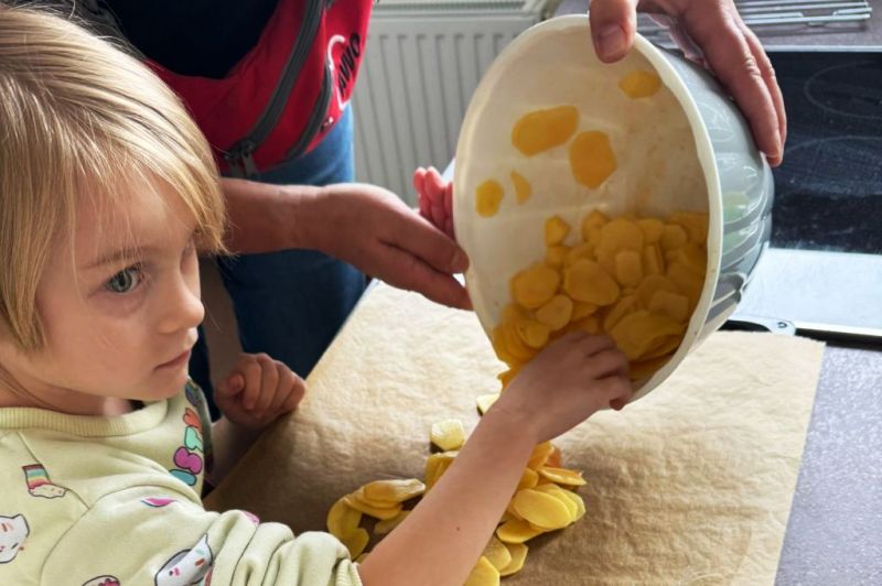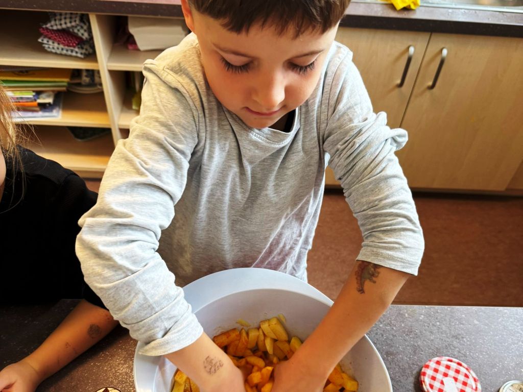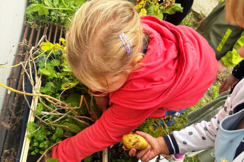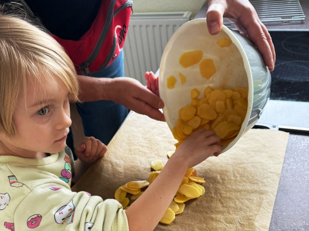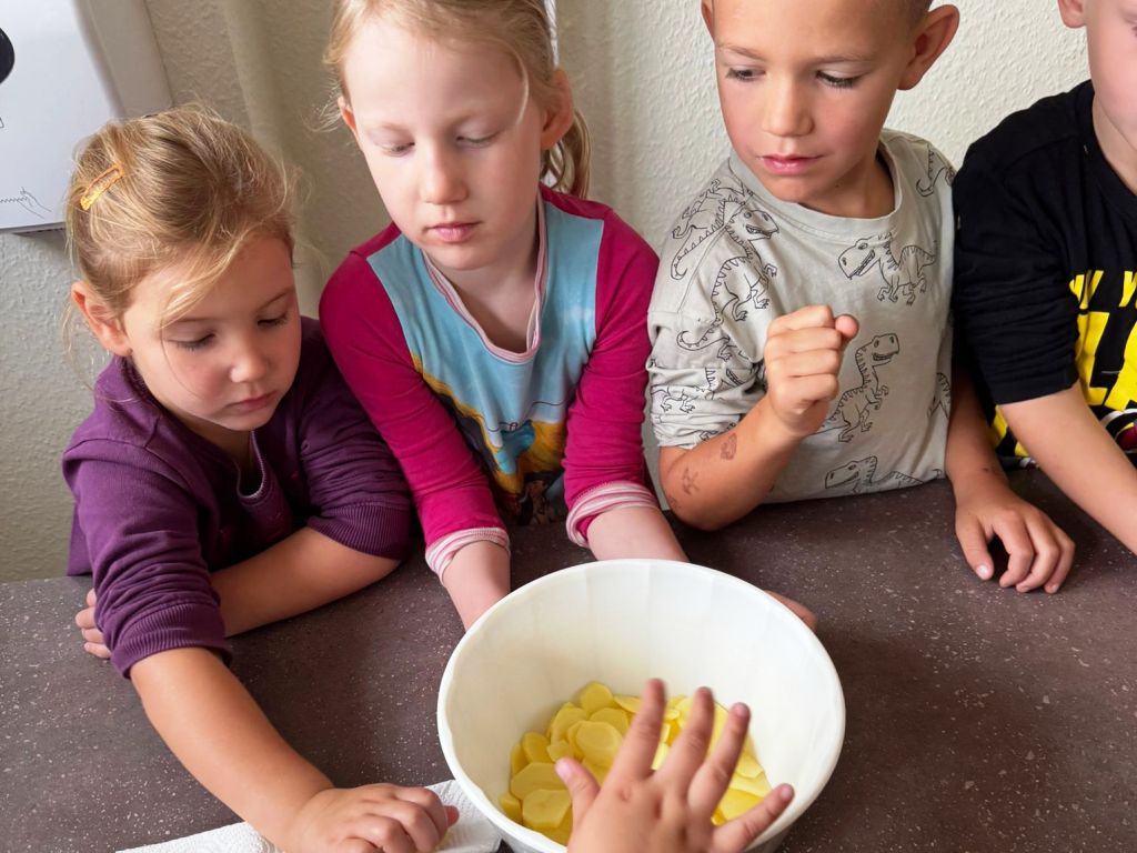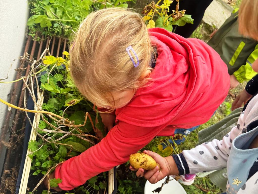 Im März haben die Kinder der AWO Kita Abenteuerland in ihrem Projekt Nachhaltigkeit zwei Kartoffeln zum Keimen in ein Aquarium gesteckt. Die Kinder aus der Gruppe Fuchsbau konnten so beobachten, was unter der Erde passiert. Letzte Woche wurde geerntet und die Kinder waren erstaunt, wie viele Kartoffeln sie ausbuddeln konnten. Anschließend haben wir die Ernte gemeinsam verarbeitet: In unserer Kinderküche entstanden knusprige Pommes und Chips. Dazu gab es leckeren Kräuterquark, den die Kinder selbst aus frischen Zutaten angerührt haben. So konnten die Kinder den gesamten Kreislauf vom Pflanzen über das Wachsen und Ernten bis hin zur Zubereitung und zum Genießen erleben – ein wertvoller Einblick in Nachhaltigkeit und gesunde Ernährung.