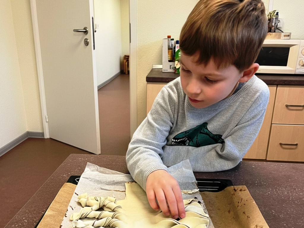 Die Gruppe Zauberflitzer hat mit viel Freude und Kreativität einen wunderschönen Winterbaum aus Blätterteig gebacken. Die Aufregung war groß, als sich endlich die Ofentür öffnete und der herrliche Duft durch den Raum zog. Stolz bestaunten die Kinder ihr gelungenes Backwerk – und natürlich wurde anschließend gemeinsam probiert.