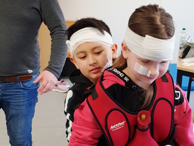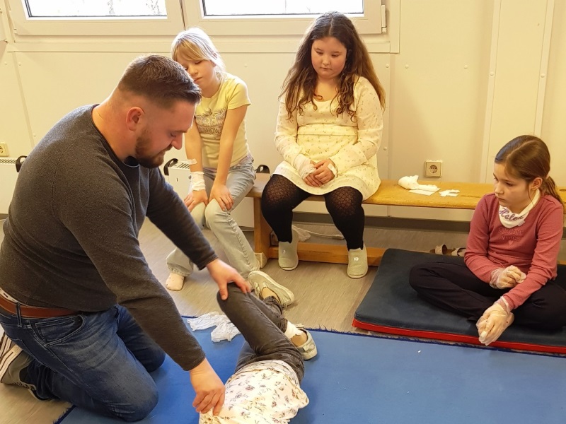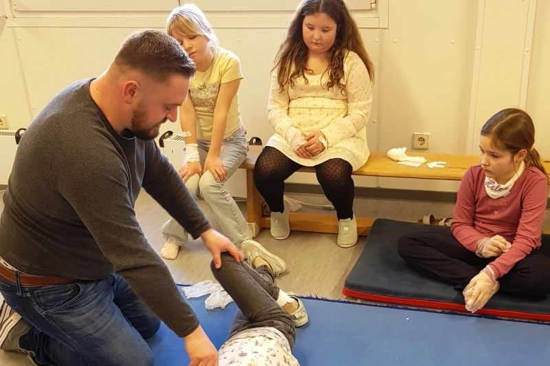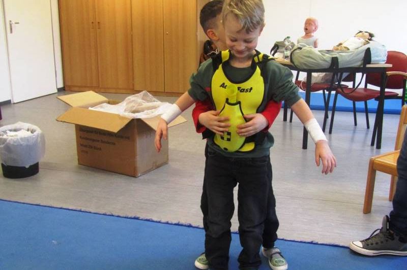 Die wichtige Telefonnummer 112 für den Rettungswagen kannten viele der Kinder schon. Sie haben unterschiedliche Verletzungen behandelt. Begeistert haben sich die Teilnehmer*innen gegenseitig verbunden. Sie haben gelernt, dass jemand, der ohnmächtig ist, ersticken kann, wenn die Zunge die Atemwege verschließt und geübt, ein Kind in die stabile Seitenlage zu bringen. Auch zwei Möglichkeiten konnten die jungen Sanitäter*innen ausprobieren um einem Kind zu helfen, dass sich an einem Bonbon verschluckt hat. Ganz spannend wurde es, als sie die Puppe Erwin „operiert“ haben und dabei die verschiedenen Organe und deren Aufgaben kennengelernt haben.