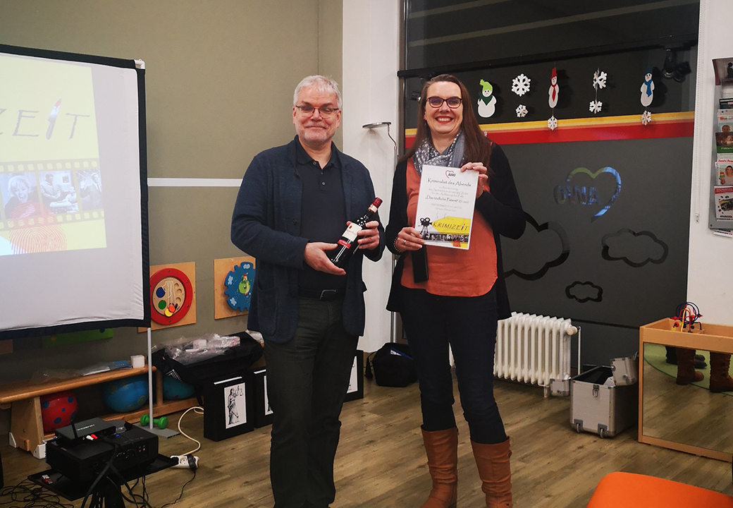 Nach dem Film wurde das Cafe FuN zum Schauplatz einer lebhaften Diskussion und Ermittlung. Die Anwesenden tauschten sich aus, um den Täter zu ermitteln, Hinweise zu analysieren und Verdächtige zu identifizieren. Vor der Auflösung gab jeder seinen Tipp ab und am Ende ging der Preis, eine Flasche Rotwein, für hervorragende detektivische Leistungen an Susanne.