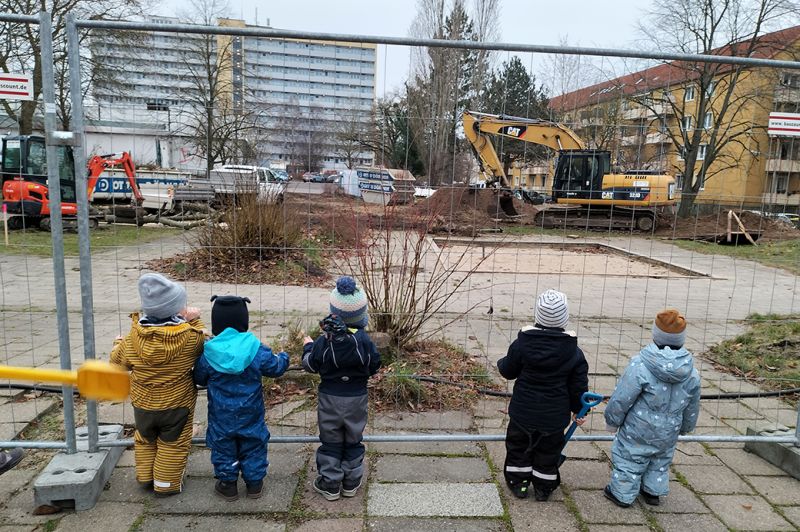 Neues aus der Kneipp Kita Regenbogen. Nun geht es endlich los…auf unserem Hof wird ein neues Krippengebäude gebaut. Die Kinder sind begeistert von den vielen Baufahrzeugen, die auf den Hof rollen. Schon morgens stehen sie im Gruppenraum an der Scheibe und warten. Dann entdecken sie die Scheinwerfer der Fahrzeuge, hören verschieden Geräusche von einer Motorsäge, einem Bagger oder das Rütteln der Baggerschaufel. Wenn wir dann auf dem Hof sind, stehen die Kleinen am Zaun und staunen. Auch für uns Erzieher*innen ist es spannend, denn es gibt noch Vieles zu planen und zu bedenken. Alle freuen sich jetzt schon auf den Umzug in das neue Gebäude.