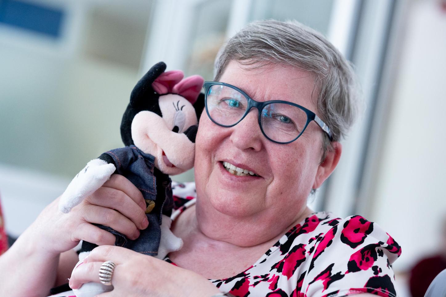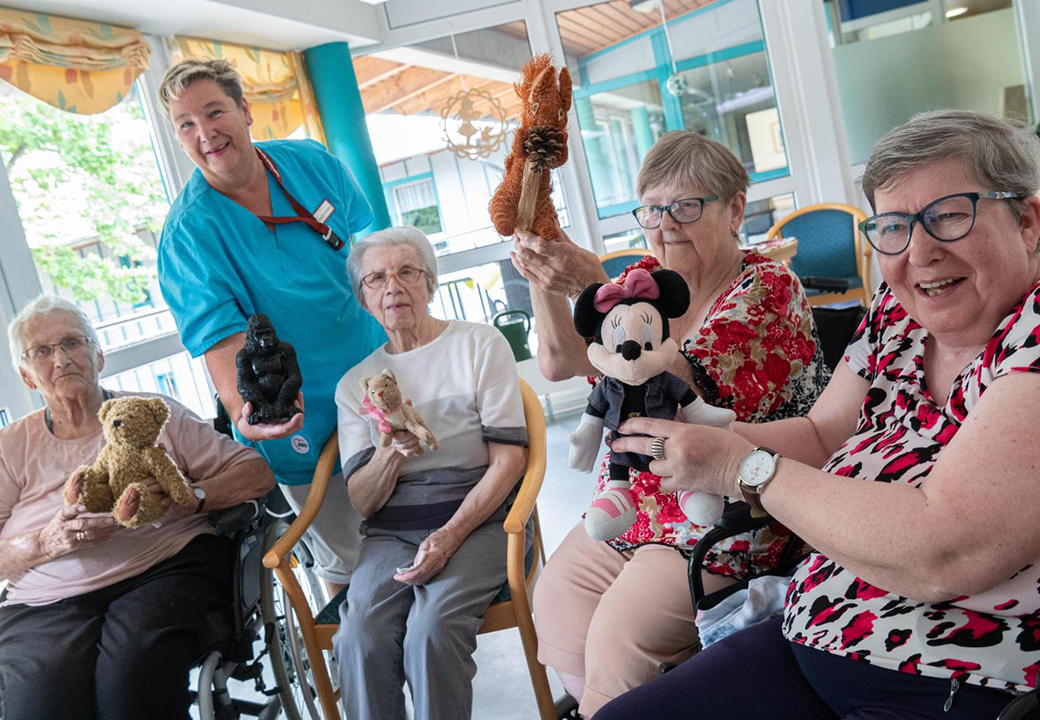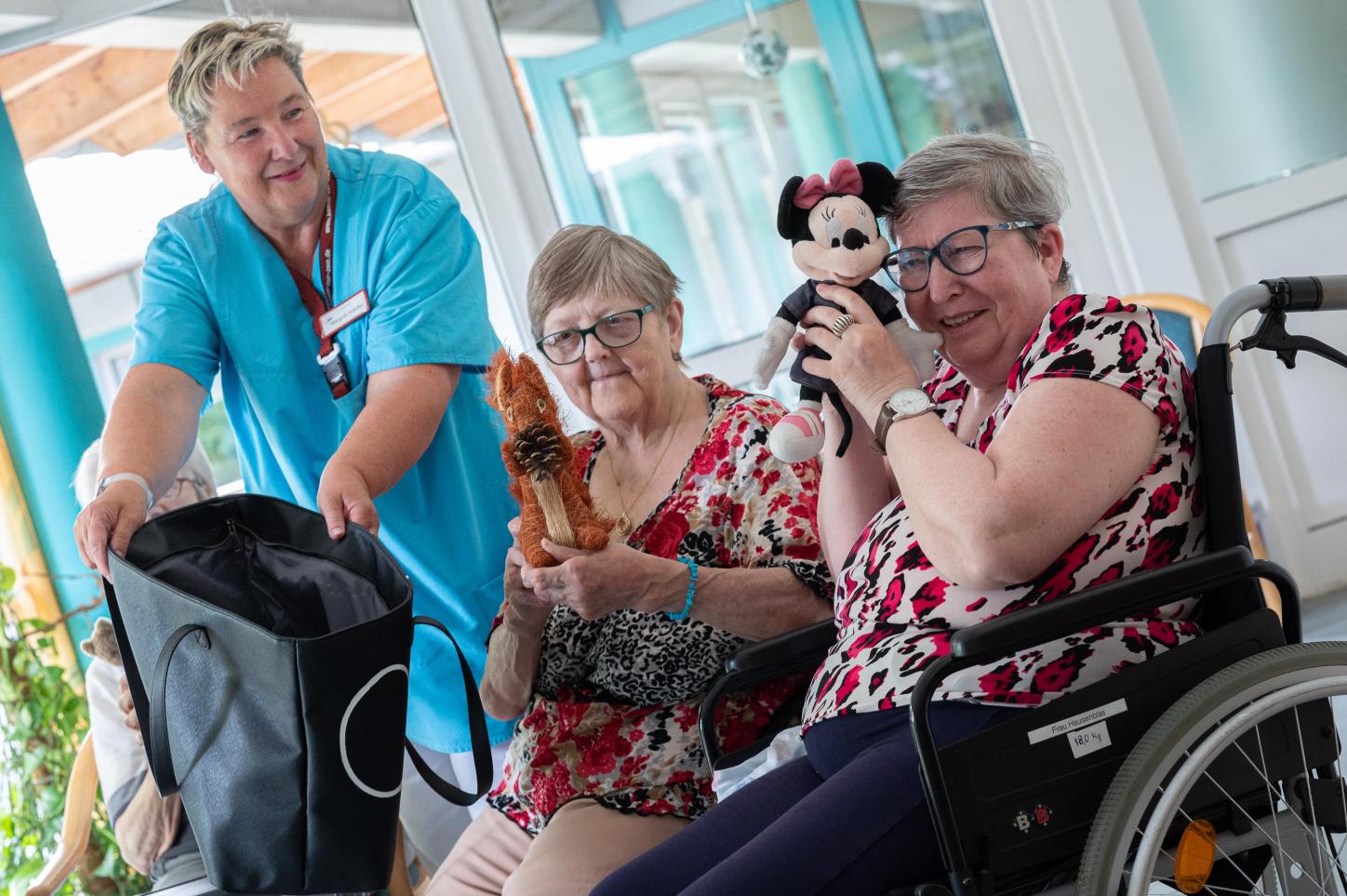 Margret Schiller zeigt ihnen eine große Tasche, die voll mit Kuscheltieren ist. „Sucht euch gern eins aus“, sagt sie und schon fischt sich Helga Rosner das Eichhörnchen heraus. Gerda Hartmann entscheidet sich für den Teddybären, Anna Schumacher für die Katze und Monika Hausenblas möchte unbedingt die Mickey Mouse. „Oh wie süß, oh wie süß.“ Verzückt drücken sich die Frauen die Tiere an die Wange.