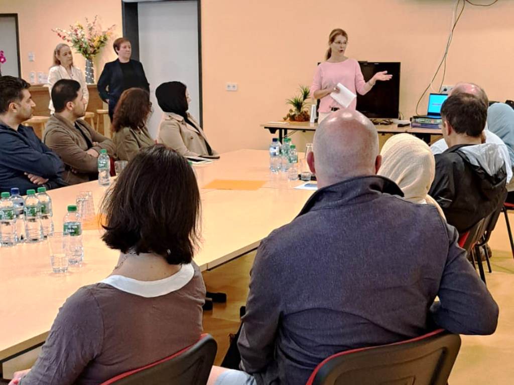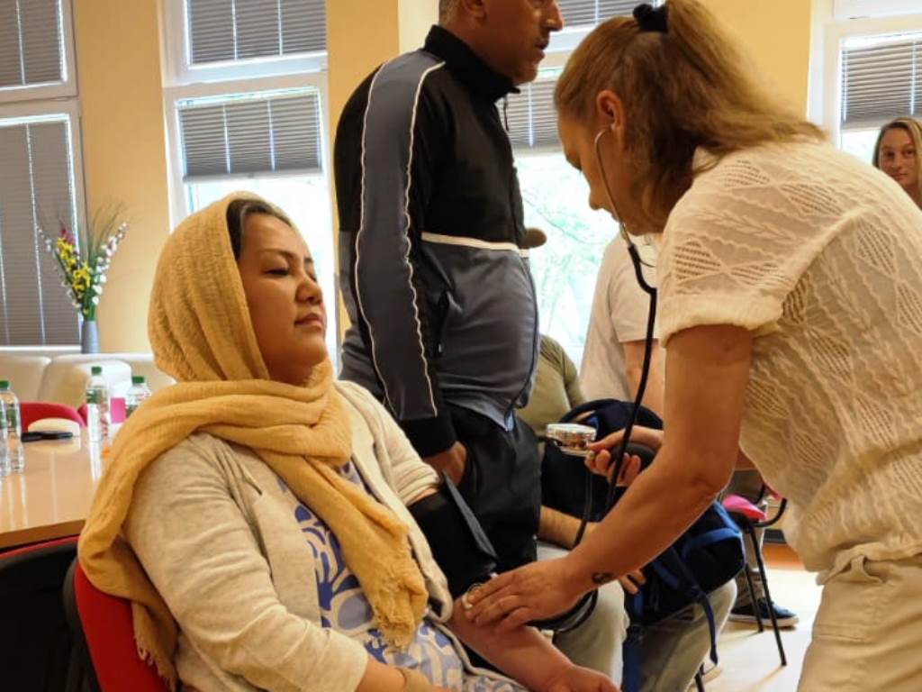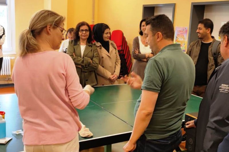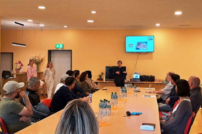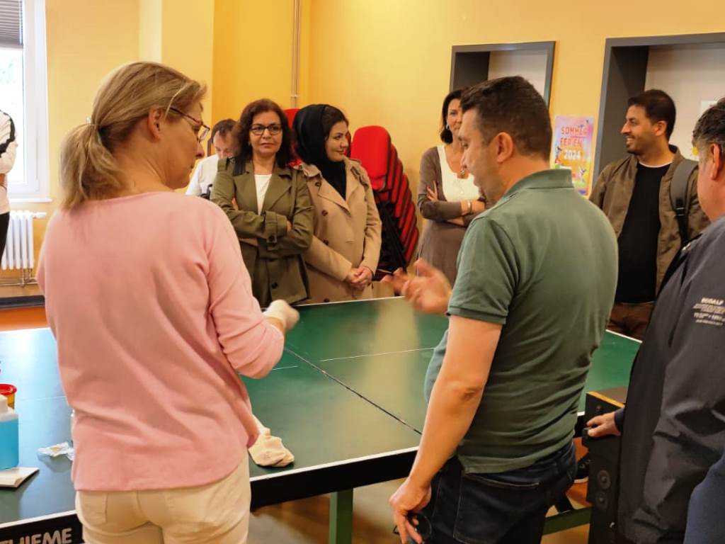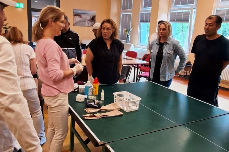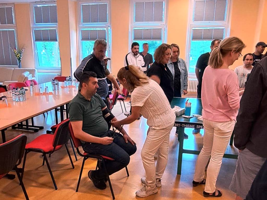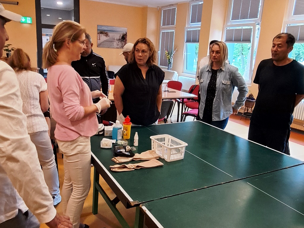 Am 17.07.24 trafen sich im Jugendclub Deja vu 23 TN und ihre Coaches vom Projekt MONI, das sind die geflüchteten Menschen mit Migrationshintergrund aus verschiedenen Herkunftsländern. Mit der Unterstützung von Frau Hansen, Frau Poschmann und Frau Borchard wurde den TN die Tätigkeiten in der Pflege nähergebracht. Das Ziel war, dass die TN genauere Kenntnisse über den Beruf und seine Anforderungen erlangten um sich beruflich orientieren zu können. Durch Präsentationen und praktische Übungen wie Blutzuckermessung, Blutdruckmessung und weiteren, wurde den TN ein Einblick in das Arbeitsleben gezeigt. Zudem war die Idee, das Interesse der Teilnehmer zu wecken, um sie für unser Unternehmen gewinnen zu können. Von der AWO ist der MA Shuhratjon Ghulomov in dem Projekt tätig und war für die Organisation auch verantwortlich. Er hat bereits 3 TN in der Pflege bei der AWO über das Praktikum in Arbeit gebracht.