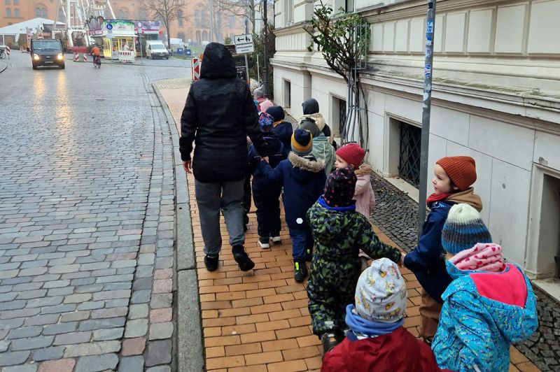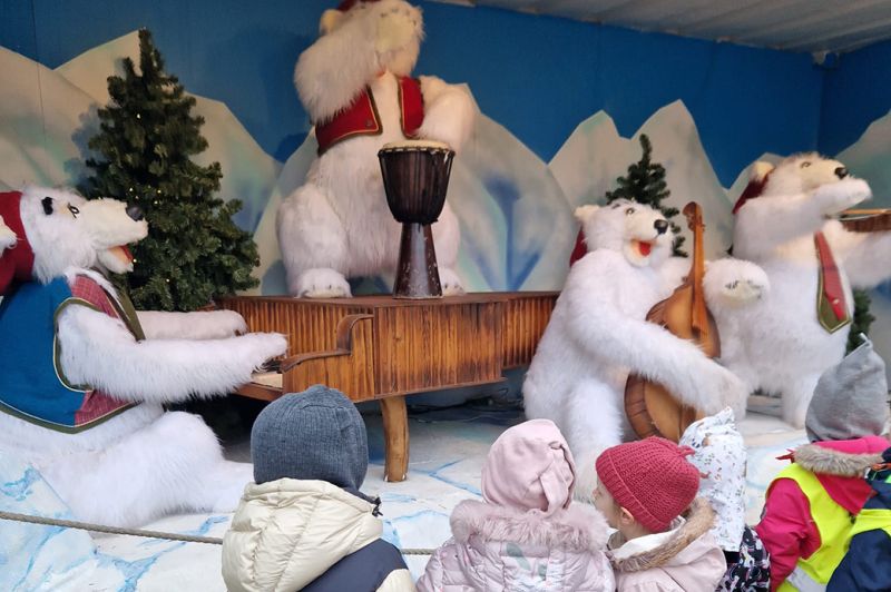Die Kinder der Kita Leuchtturm machen einen Ausflug zur Märchenstraße des Schweriner Weihnachtsmarktes! Am coolsten finden sie die tanzenden Eisbären am Markt.