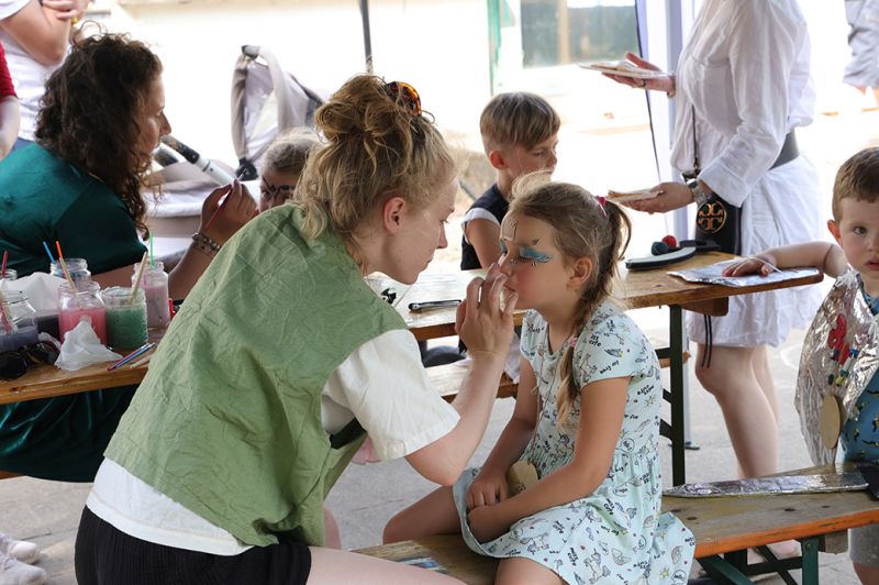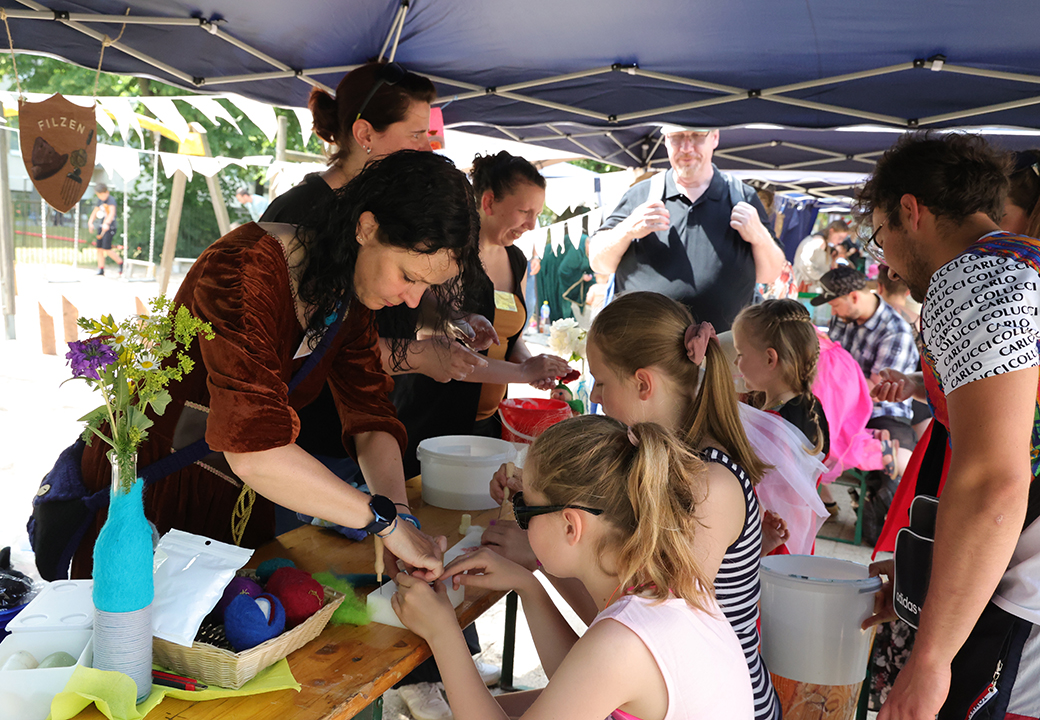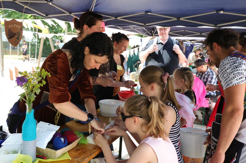 Pünktlich um 13.00 Uhr öffneten die Burgtore. Ca. 400 Gäste besuchten die Handwerkergasse mit den vielen Angeboten, wie Filzen, Basteln mit Ton, Fädeln von Schmuck. Es gab verschiedene Sportspiele, wie Hufeisenwerfen, Bogenschießen auch für die Eltern, Hammerwerfen, Sackhüpfen und vieles mehr. Am Schminkstand konnte man sich aufhübschen lassen. Auch unsere Ritterhüpfburg war gut besucht.