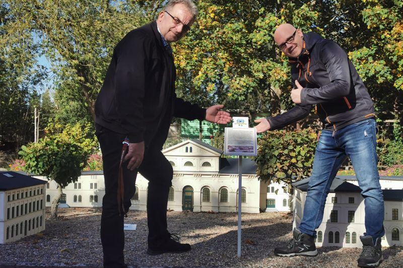 Volker Schröder, Leiter des Parks, und Stefan Igel, Assistent der Leitung, freuen sich sehr über diese neue Attraktion uns sagen Danke bei der Projektleiterin Janine Pleger von der Firma Maxpress. Sie hat die QR-Codes gemeinsam mit Bastian Pastoors, Mitarbeiter Modellbau, angebracht.