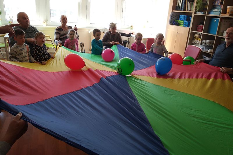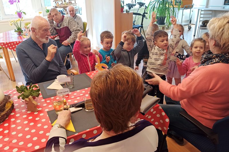 Ostern in der Tagespflege am Dreescher Markt. Große Freude bei den Tagesgästen. Die Patenkinder aus der Kita waren mal wieder zu Besuch. Für die Lütten hatten die Kolleg*innen Osterkörbchen versteckt. Allein das Zuschauen beim Suchen und Finden war für die Tagesgäste Freude pur. Danach führten die Kinder ein kleines Osterprogramm auf. Bei Kakao und Schokohasen wurde getanzt und gesungen und alle hatten einen Riesenspaß mit dem Schwungtuch.