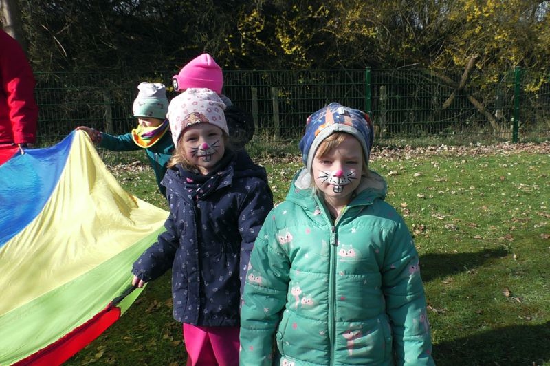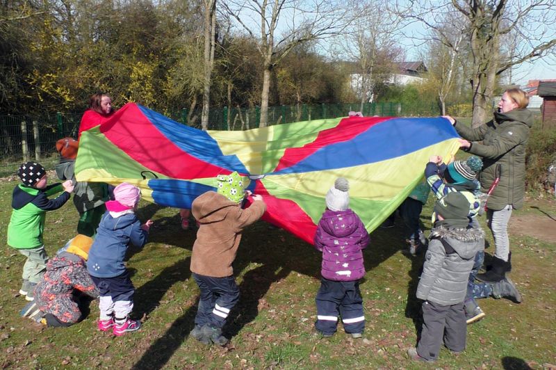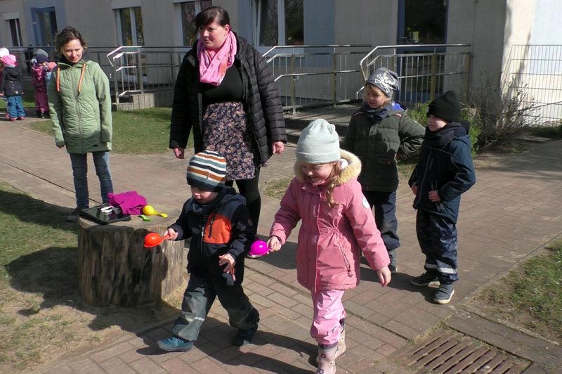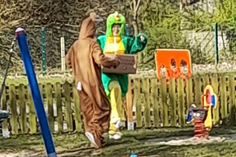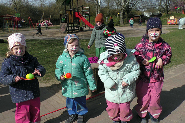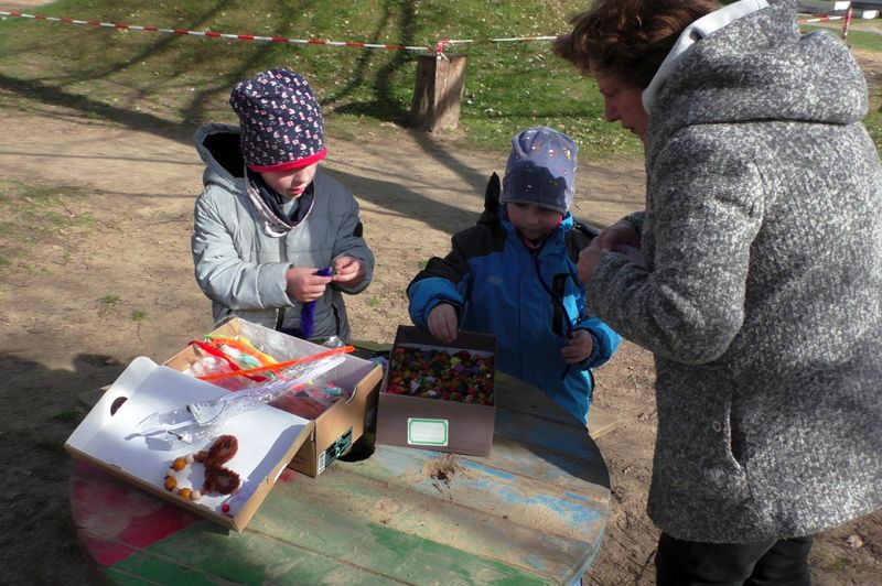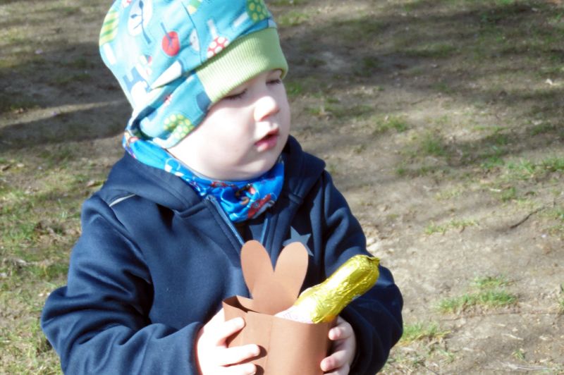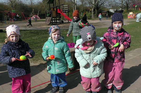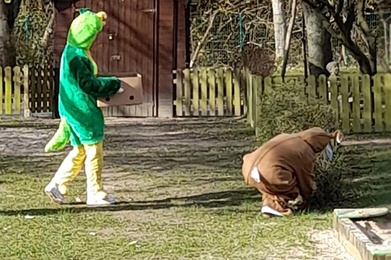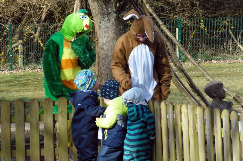 Oh du liebe Güte... das ist doch der Osterhase, der dort angehoppelt kommt und wen hat er mitgebracht? Ein großer Vogel begleitet Meister Lampe und hilft dabei, kleine Osterüberraschungen für die Kinder zu verstecken. Die Lütten haben sie schon entdeckt und drücken sich ihre Nasen an der Scheibe platt. Doch vor dem Eiersuchen gab es erst einmal ein leckeres Frühstück. Frisch gestärkt stürmten die Kinder auf den Hof und gingen sogleich auf Osternestsuche. Aber das war natürlich nur ein Teil des Osterfestes. Mit vielen lustigen Angeboten wie, Eierlaufen, Spielen mit dem Schwungtuch, Kinderschminken und Osterhasen basteln hatten die Kinder einen Riesenspaß. Immer mit dabei, der Osterhase und sein bunter Vogel. Besonders die Krippenkinder waren total fasziniert von den Kostümen. Im Osterhasenkostüm steckte Lara (BfDlerin und zukünftige Azubine) und im Vogelkostüm Celina (Azubine im 1. Jahr). Die zwei haben zur Nachmittagsvesper auf Wunsch der Kinder leckere Waffeln gebacken. Ein dickes Dankeschön an die Zwei! Ein toller Tag und ein rundum gelungenes Fest mit bestem Wetter!