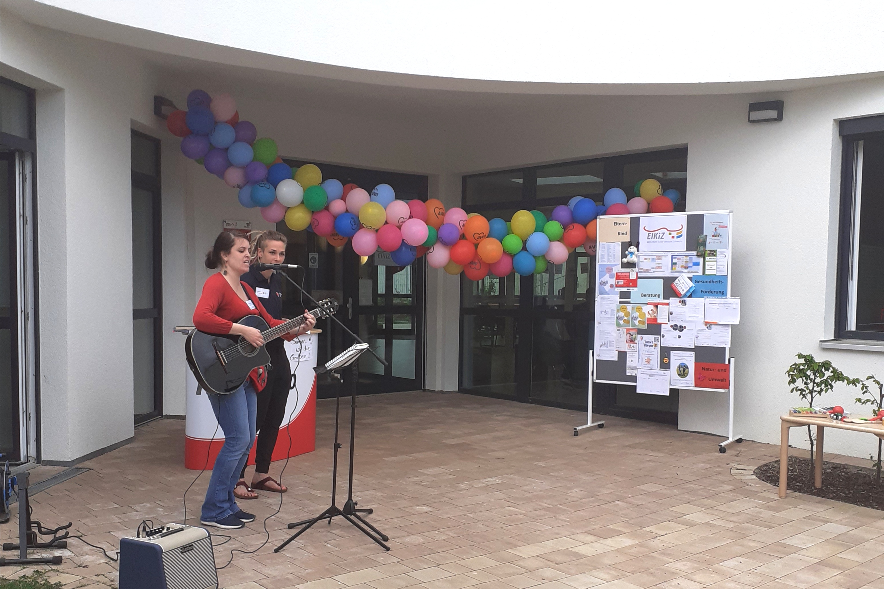 „Quartier Offen“ - So hieß das Motto am Samstag den 14. Mai 2022 zum Tag der offenen Tür im ElKiZ (Eltern-Kind-Zentrum Schwerin). Das Event präsentierte sich im einladend farbenfrohen Kleid und versprach eine Menge Spaß für jedermann. Dazu wurde zuvor emsig geplant und alles fleißig vorbereitet. Dann konnte es losgehen und die Besucher, ob groß oder klein, wurden von vielen AWO Kollegen aus den Bereichen „Kita Igelkinder“, „Bewegungsbad“ und „Familienbildungsstätte“ empfangen. Auch die Kolleginnen Nadine und Lio vom DRK Team „Wasserspaß“ waren mit dabei. Es gab Kaffee und Kuchen und Interessierte konnten sich gestärkt durch die Kita führen lassen. Ein weiteres Highlight war die „Open Mic“ Veranstaltung. Hier gab es tolle Live-Musik zum Genießen, Tanzen und es wurde manch ein Talent entdeckt.