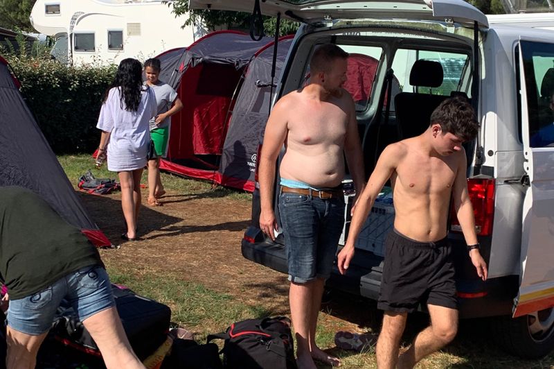 Bevor es mit dem Urlaub so richtig losgehen kann, mussten wir natürlich erst einmal unser Lager aufschlagen. Ohne die aktive Unterstützung unserer Erzieher hätten wir vermutlich die erste richtige Nacht ohne Zelt am Strand geschlafen, aber am Ende wurde alles gut. Nachdem alles eingerichtet war, ging es auch sofort los zum Baden. Der Hunger sorgte dafür, dass wir abends aus dem Wasser kamen, um die erste Pizza und eine kalte Cola zu genießen.