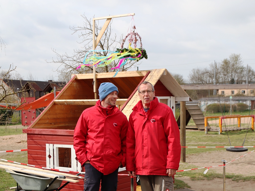 Das Spielhaus in der AWO-Kita „Kleines Schulzen“ in Görries ist in die Jahre gekommen – doch dank Hartmut und Alex wird es bald wieder zum bunten Mittelpunkt unseres Garten. Mit viel Engagement haben die beiden das Haus komplett abgebaut, geschliffen, repariert und frisch lackiert. Nun wächst es Stück für Stück wieder in die Höhe – und heute war es soweit: Der Dachstuhl steht! Grund genug für ein kleines Richtfest. Auf dem Dach steht ein geschmückter Baum, und unser Bauleiter Hartmut hat einen feierlichen Spruch aufgesagt – ganz traditionell. Mit Apfelsaftschorle haben wir gemeinsam mit den Kindern gefeiert.