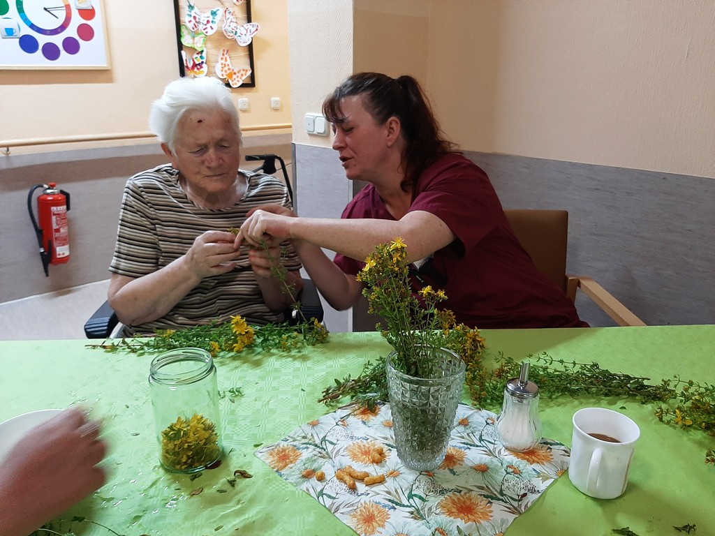 Am 24. Juni feierten wir gemeinsam mit unseren Bewohnern das erste Johannisfest. Es war spannend zu beobachten, was unsere Bewohner für Vorstellungen zu diesem Fest hatten und viele dachten es gehe "nur"um ein kirchliches Fest. Die Verbindung zu Ernte, Garten oder Mittsommer war kaum jemanden bewusst. So fand ein interessanter Austausch dazu statt, wir beschäftigten uns mit der Entstehung des Festes, mit verschieden Bräuchen, hörten Geschichten und wurden Kreativ. Gemeinsam setzen wir "ROTÖL" an, welches aus den Blüten des Johanniskrauts hergestellt wird. Alle Bewohner halfen die Blüten zu zupfen. Wir sind gespannt auf das Ergebnis welches in einigen Wochen in kleine Fläschchen abgefüllt werden kann.