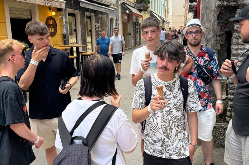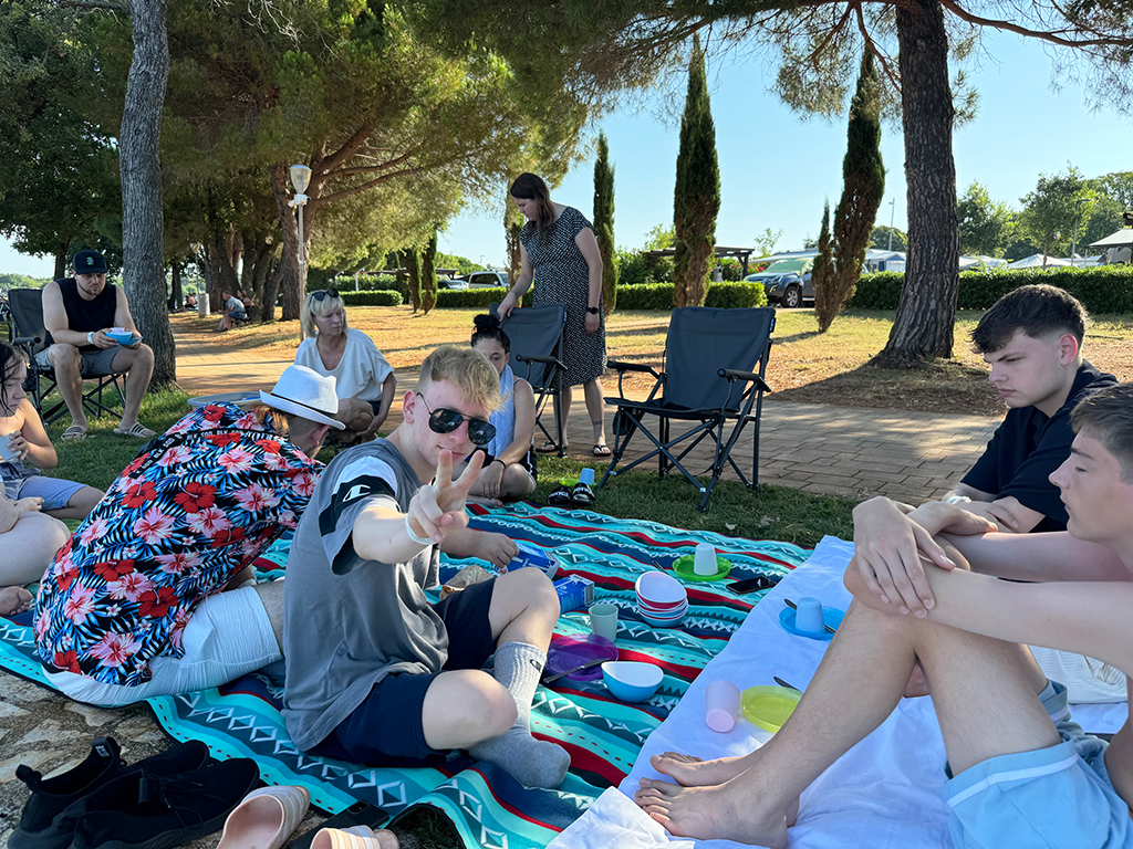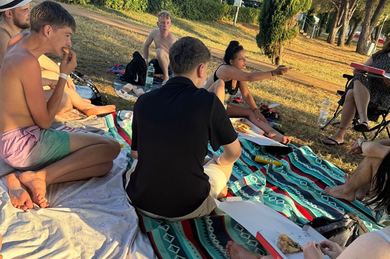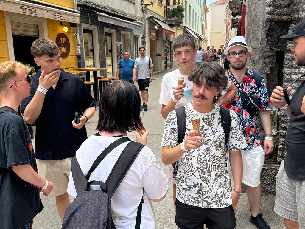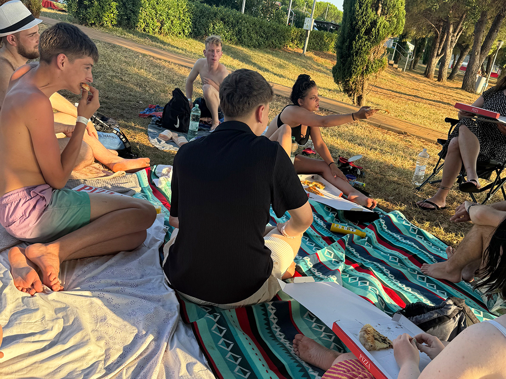 Auch den zweiten Tag haben wir mit einem Frühstück am Meer begonnen – mit Meeresrauschen und Brötchenkrümeln. Bei gemütlichen 33 Grad im Schatten haben wir uns gestärkt auf den Weg nach Pula gemacht – was für ein heißer Ritt! In Pula angekommen haben wir erst unseren Blick auf die vielen Sehenswürdigkeiten gerichtet und dann auf die unzähligen Eisstände und Souvenirläden – eine echte Herausforderung für unser Taschengeld. Ein paar von uns haben sich ein tolles Andenken gekauft, andere haben sich in Eiscreme gehüllt – das eine schmilzt schneller, aber beide machen glücklich. Wir waren froh, als wir wieder zurück auf dem Campingplatz waren und uns beim Baden abkühlen konnten. Am Abend stand dann Pizza auf dem Speiseplan – der perfekte Abschluss für einen heißen, aber supercoolen Tag.