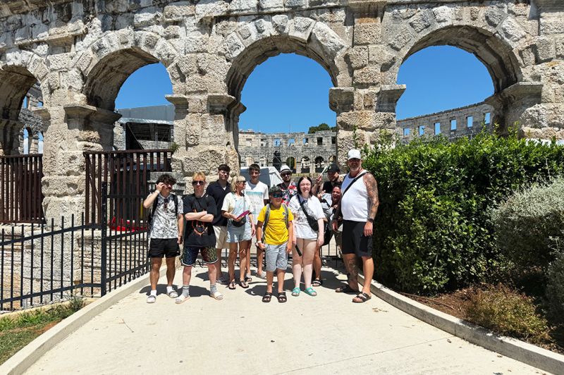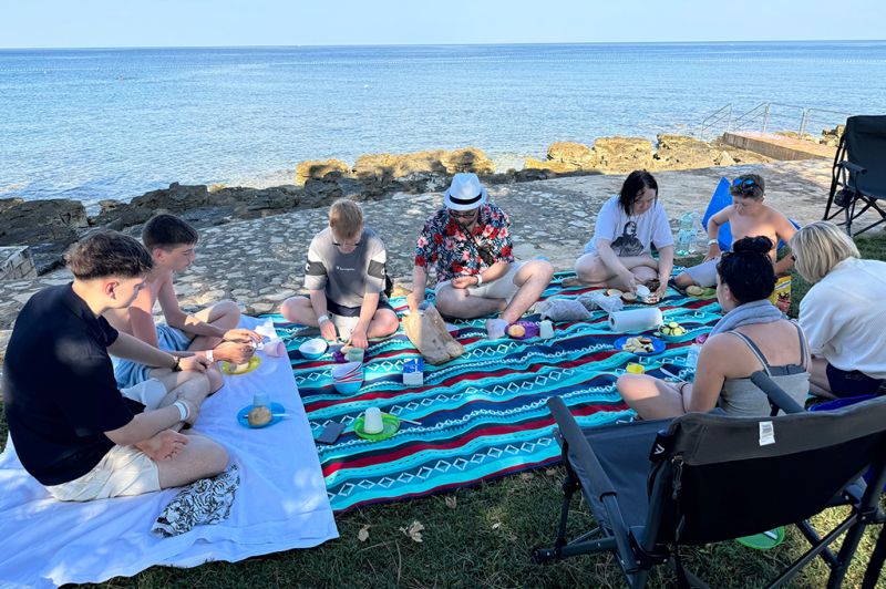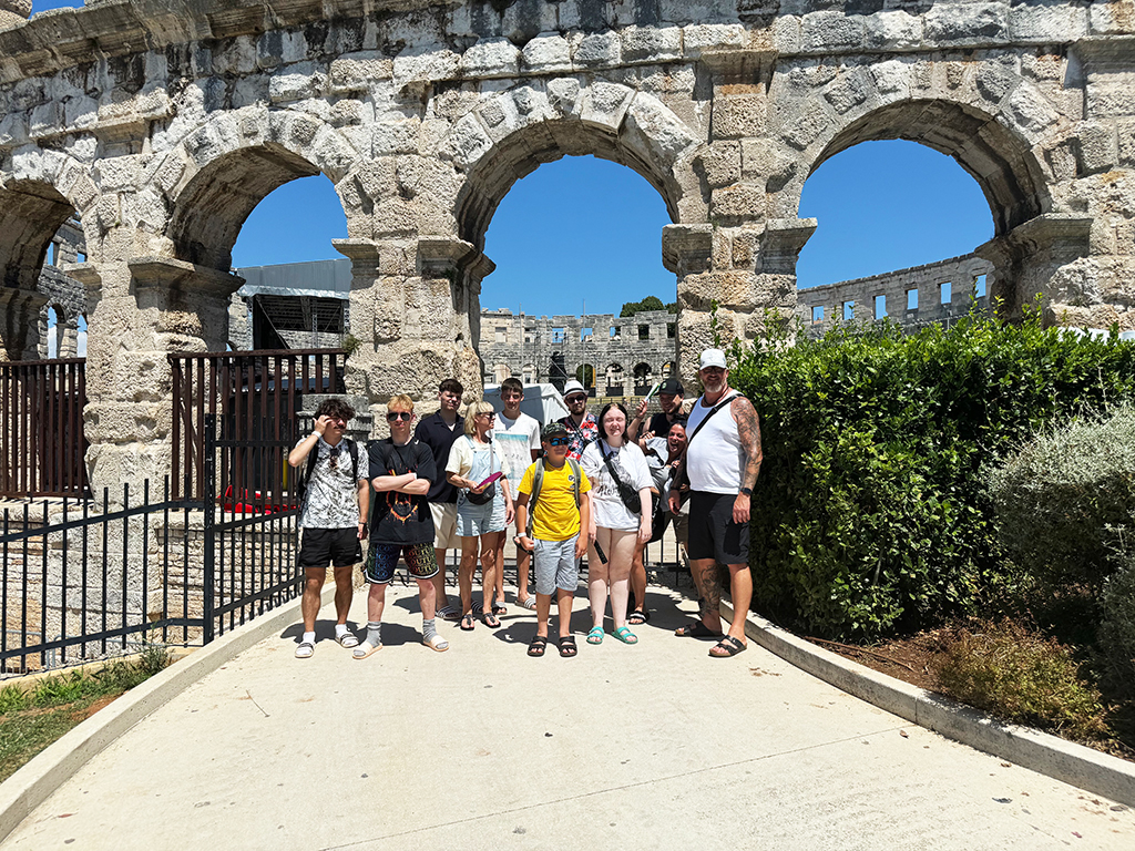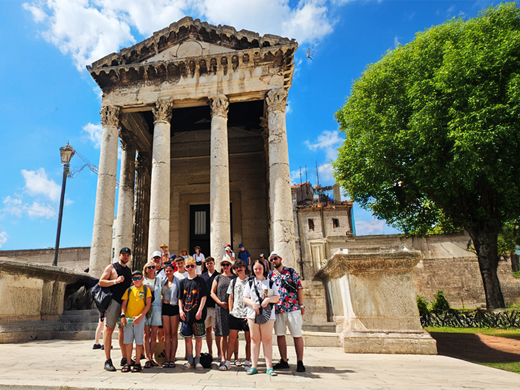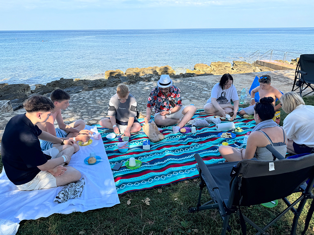Auch den zweiten Tag haben wir mit einem Frühstück am Meer begonnen – mit Meeresrauschen und Brötchenkrümeln. Bei gemütlichen 33 Grad im Schatten haben wir uns gestärkt auf den Weg nach Pula gemacht – was für ein heißer Ritt! In Pula angekommen haben wir erst unseren Blick auf die vielen Sehenswürdigkeiten gerichtet und dann auf die unzähligen Eisstände und Souvenirläden – eine echte Herausforderung für unser Taschengeld. Ein paar von uns haben sich ein tolles Andenken gekauft, andere haben sich in Eiscreme gehüllt – das eine schmilzt schneller, aber beide machen glücklich. Wir waren froh, als wir wieder zurück auf dem Campingplatz waren und uns beim Baden abkühlen konnten. Am Abend stand dann Pizza auf dem Speiseplan – der perfekte Abschluss für einen heißen, aber supercoolen Tag.