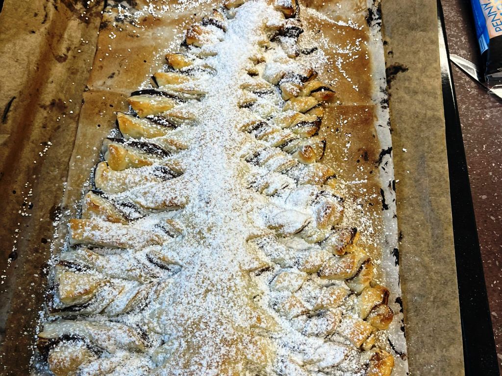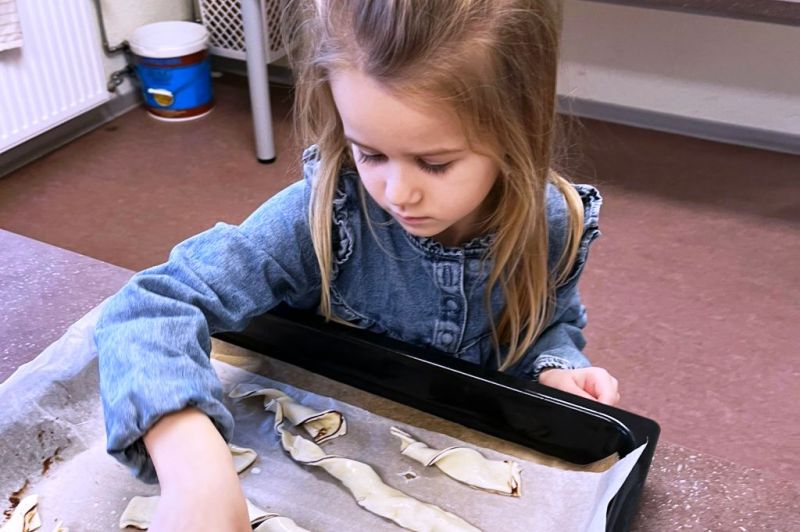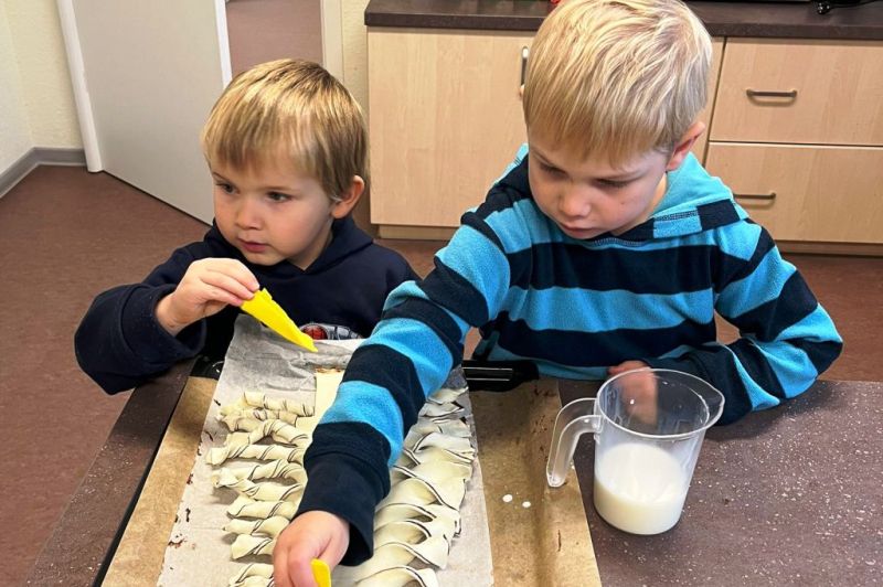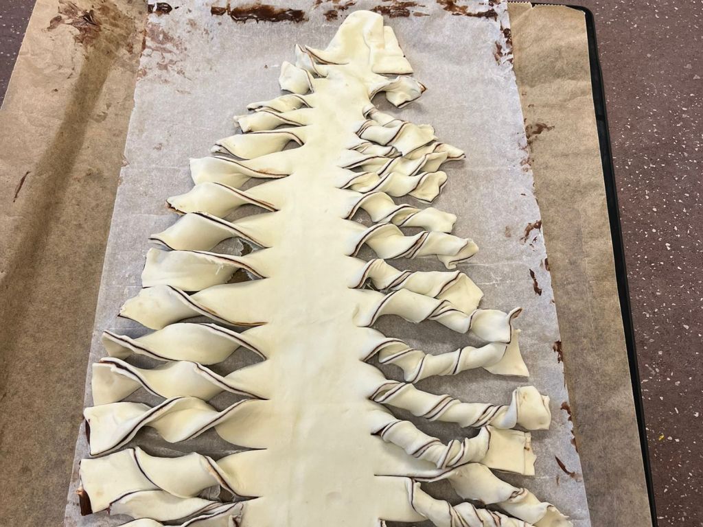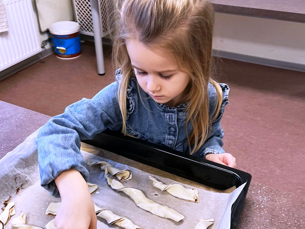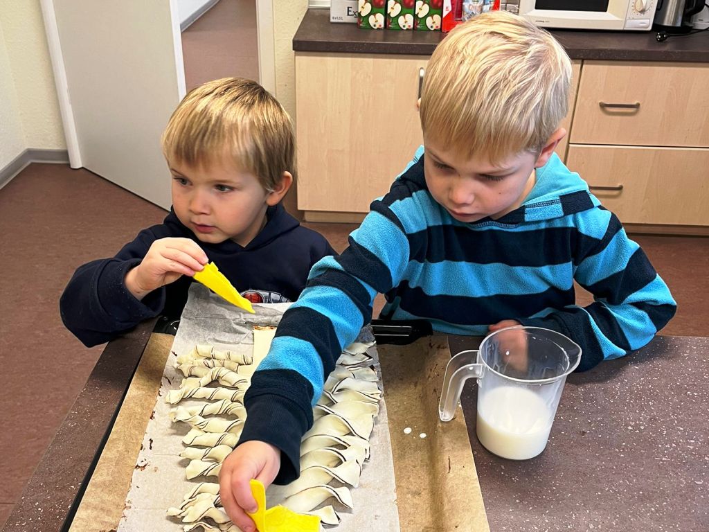 Die Gruppe Zauberflitzer hat mit viel Freude und Kreativität einen wunderschönen Winterbaum aus Blätterteig gebacken. Die Aufregung war groß, als sich endlich die Ofentür öffnete und der herrliche Duft durch den Raum zog. Stolz bestaunten die Kinder ihr gelungenes Backwerk – und natürlich wurde anschließend gemeinsam probiert.